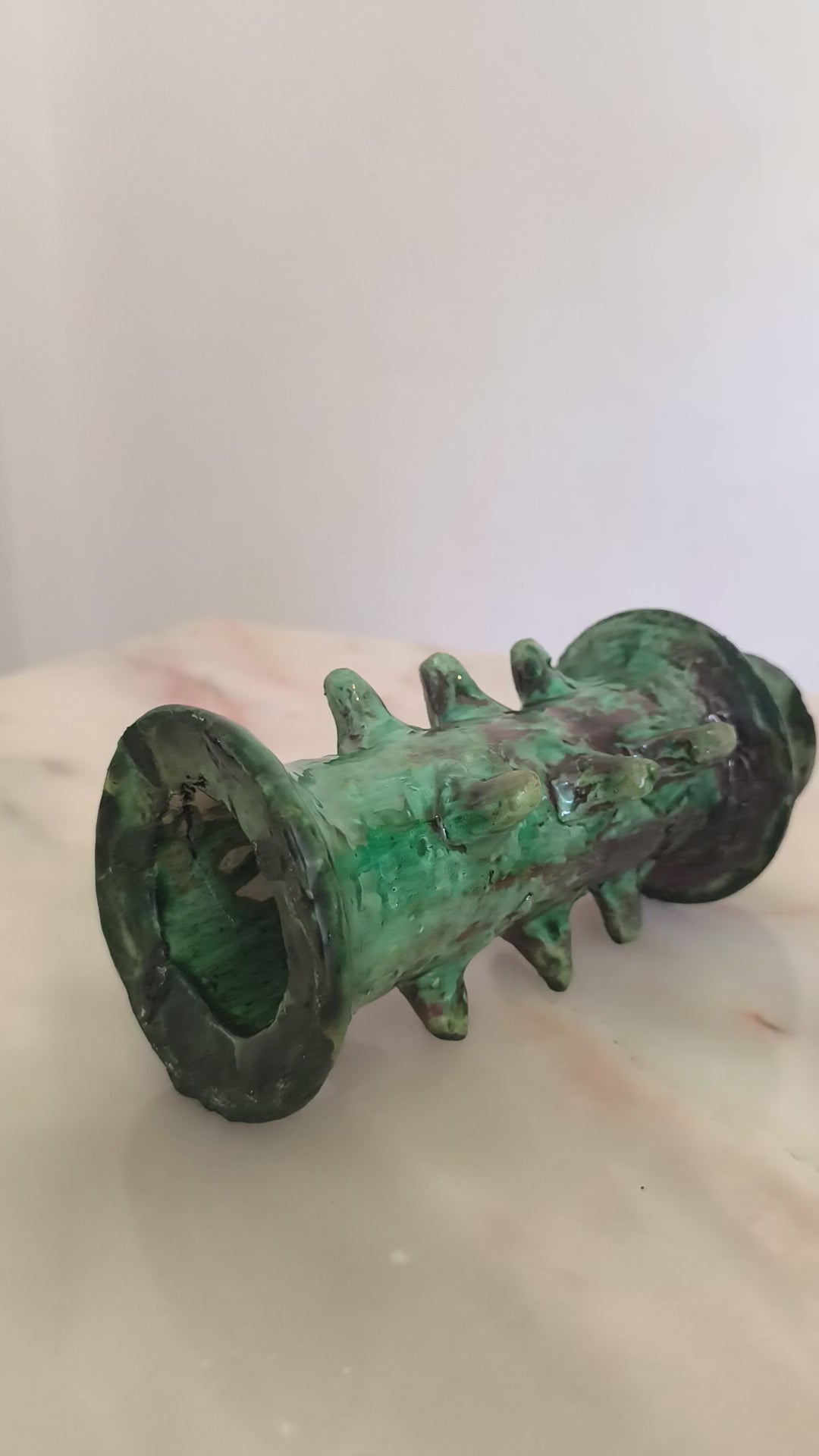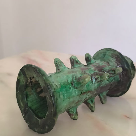 Handmade unique Tamegroute taper candles holder made from ceramic. It's a beautifully made candlestick with a rustic, green earthy charm. The textured green glaze and sculptural design add a touch of bohemian flair to any space. Perfect for adding a cozy ambiance to your home decor.