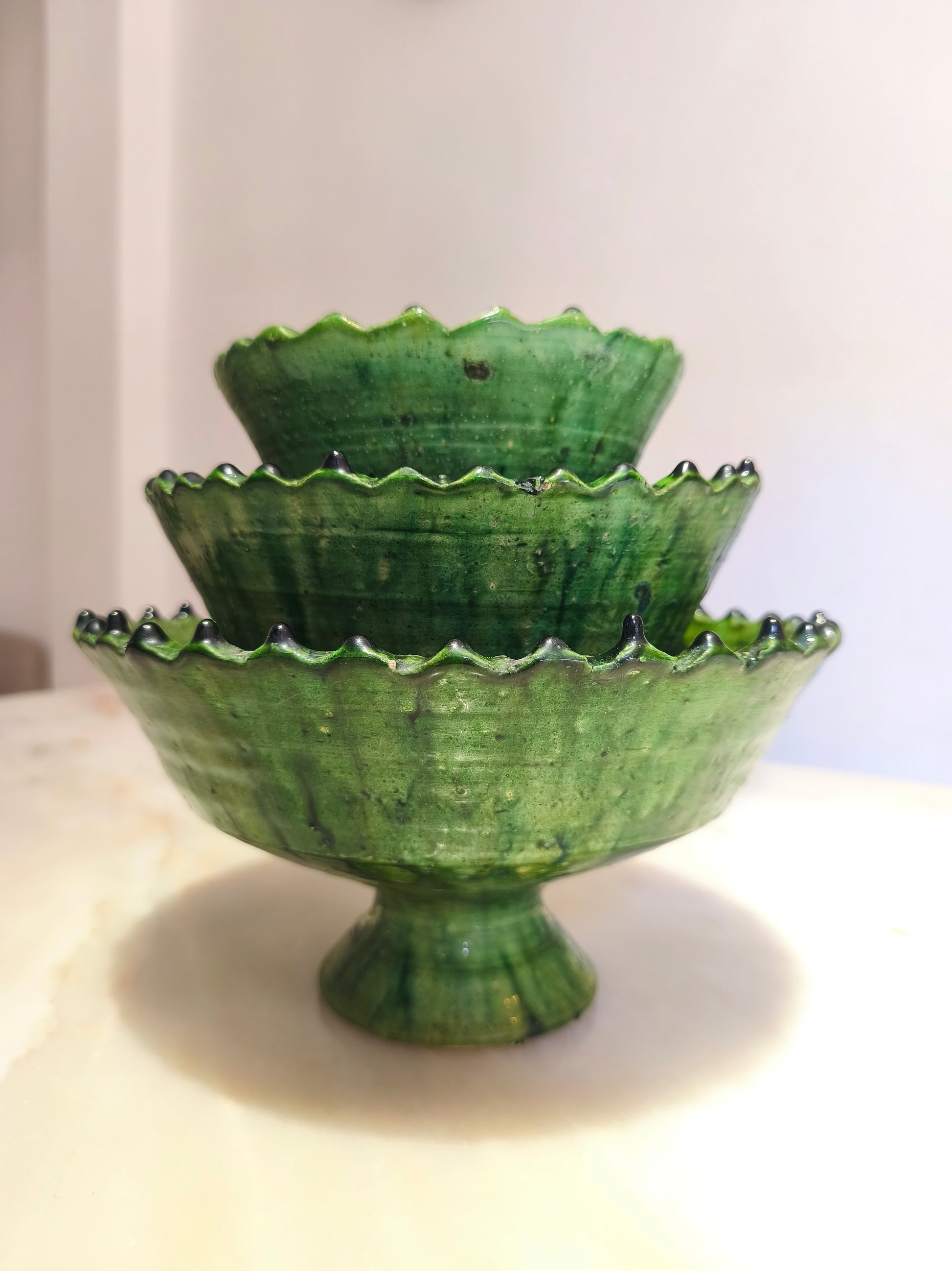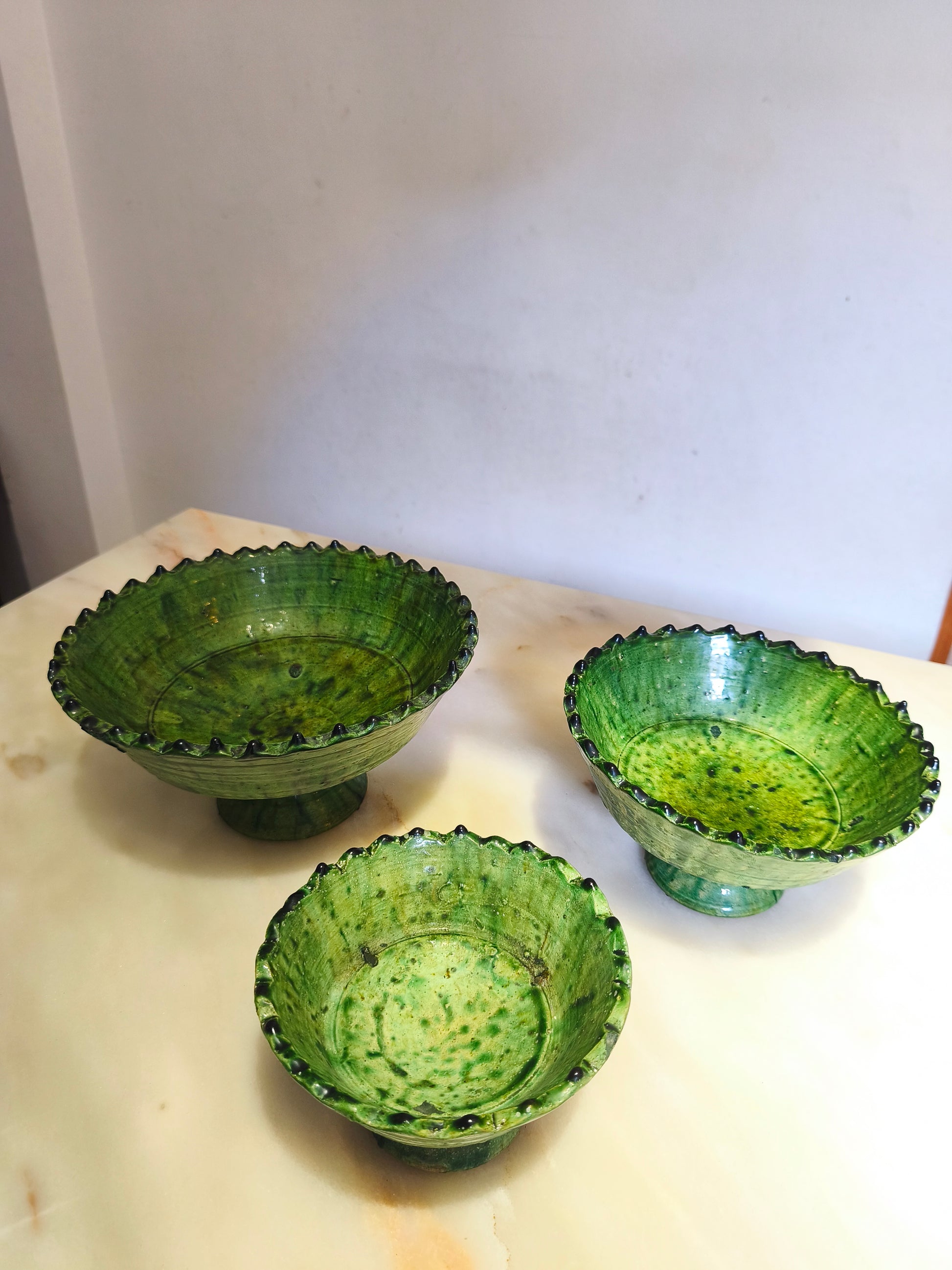 Bring authentic Moroccan craftsmanship into your home with this handmade Tamegroute green pottery bowl set of 3 green footed bowls, crafted by skilled artisans in southern Morocco using traditional techniques passed down through generations.