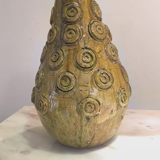 This stunning golden Tamegroute vase is a masterpiece of traditional Berber pottery, handcrafted by skilled artisans in Morocco. The distinctive raised spiral pattern creates a mesmerizing texture that catches the light beautifully, while the rich golden glaze adds warmth and elegance to any space.