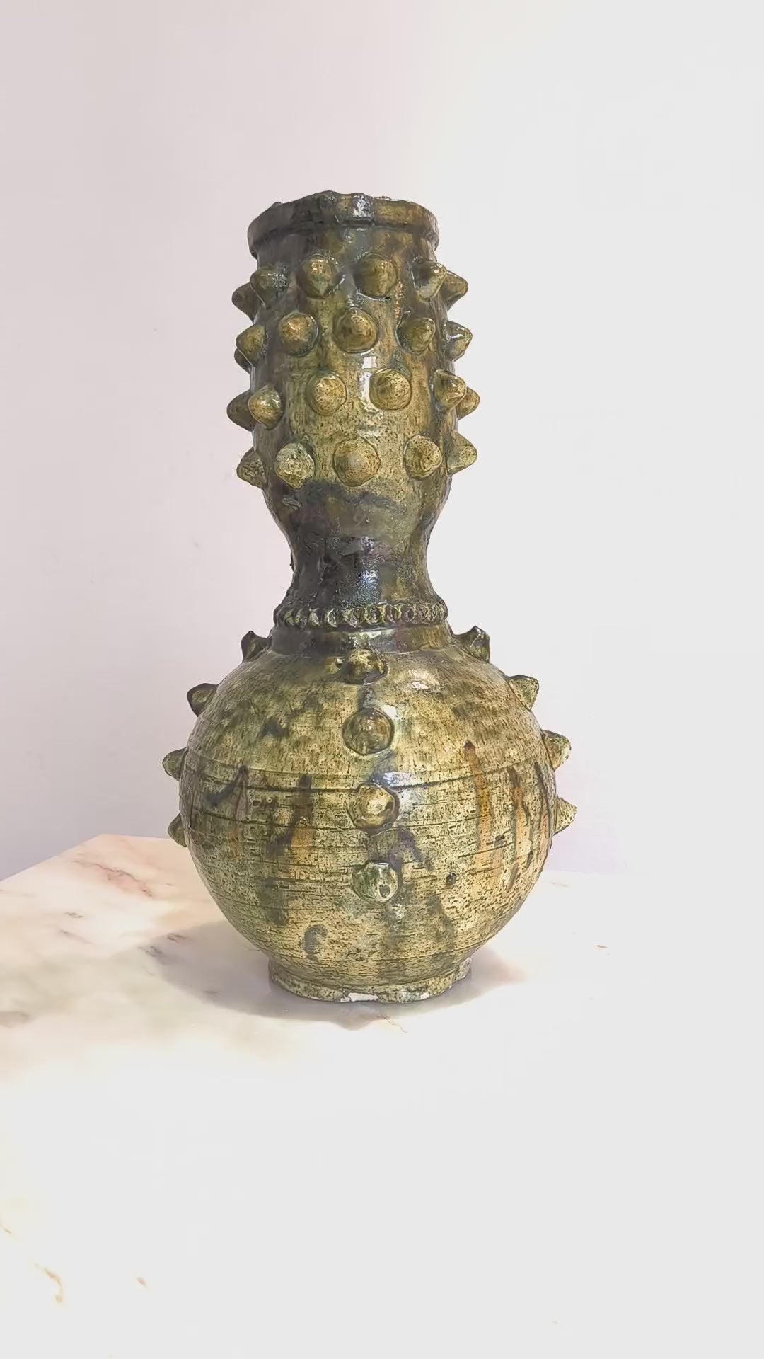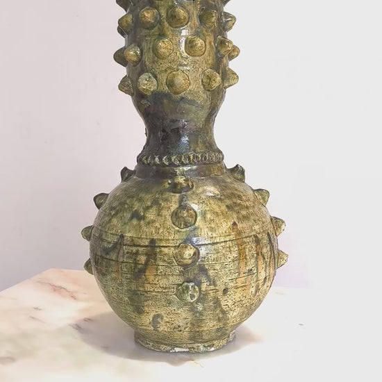This handcrafted ceramic vase is a striking decorative piece, featuring bold raised textures and an earthy green glaze with natural golden and dark undertones. Its sculptural form and artisanal finish make it a true statement object for modern, bohemian, or rustic interiors.