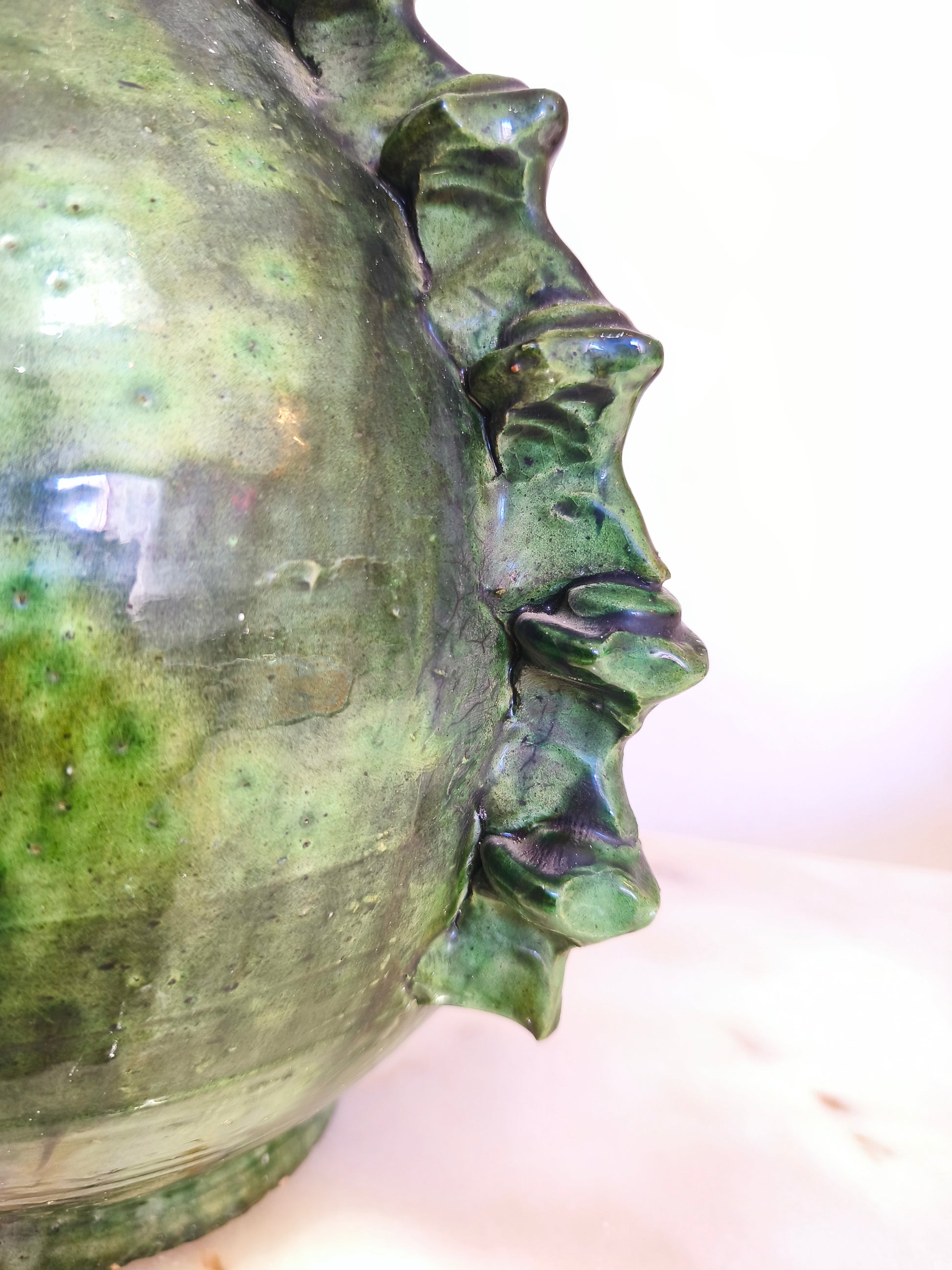 This tall handmade Tamegroute vase is a true statement piece, crafted by artisans in southern Morocco using ancestral techniques passed down through generations. Its deep green glaze, organic texture, and sculptural silhouette make each piece completely one of a kind.