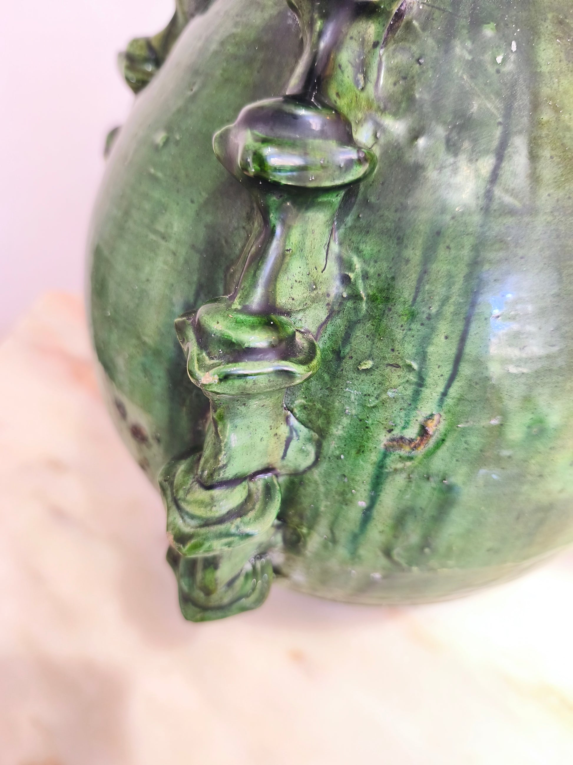 - Traditional green glaze with natural variations